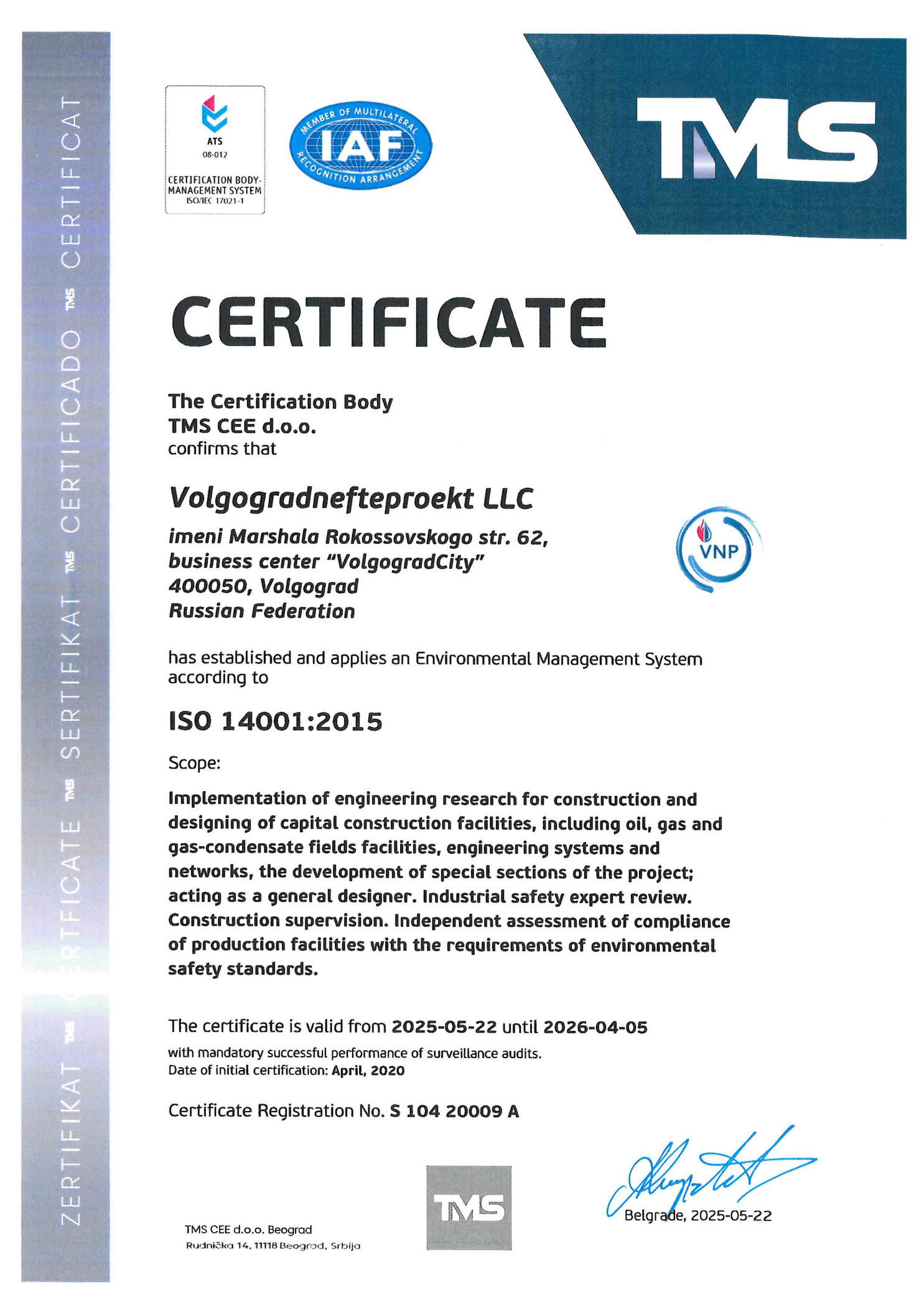 “One of the tools for managing the activities of LLC “Volgogradnefteproekt” is the Integrated Management System (comprising the quality management system, environmental management system, and Health, Safety and Environment Management system).